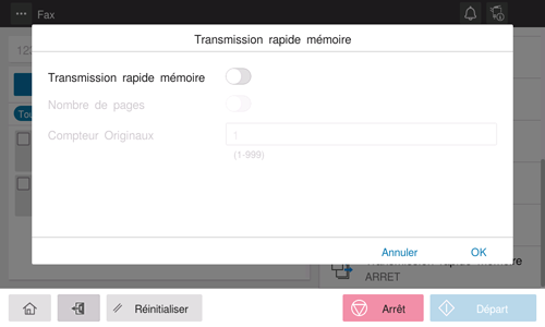Émis. rapide mémoire est une méthode permettant de lancer l'envoi d'un fax dès qu'une page de l'original a été numérisée. Le nombre total de pages envoyées peut être saisi dans les informations sur l'expéditeur.