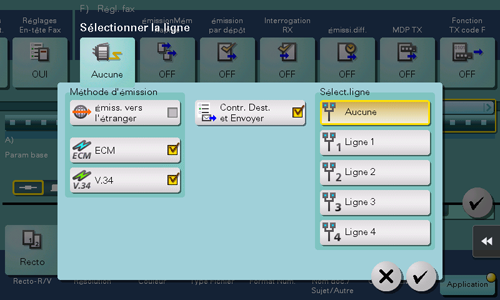 Appuyez sur [Application] - [Régl. fax] - [Sélectionner la ligne].