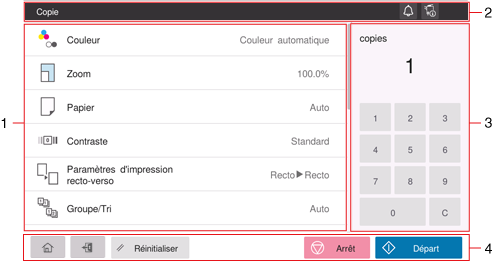 Si vous appuyez sur [Copie] sur l'écran d'accueil, l'écran principal du mode copie s'affiche.