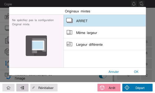 Même pour un original avec des pages de formats différents, le Chargeur ADF vous permet de numériser les données tout en détectant le format de chaque page. Si les largeurs des originaux sont identiques, sélectionnez [Même largeur]. Si les largeurs des originaux ne sont pas identiques, sélectionnez [Largeur différente].