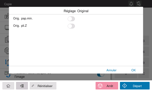 [Original Plié en Z] | Si un original plié est chargé dans le Chargeur ADF, il se peut que le format de l'original ne puisse pas être détecté de manière exacte. Pour numériser un original plié dans le chargeur ADF, activez cette option. |