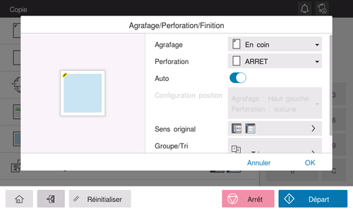 [Réglage Position] | Sélectionnez la position de reliure pour l'agrafage des feuilles. Le réglage [Auto] détermine automatiquement la position d'agrafage en fonction du sens de chargement de l'original. |
