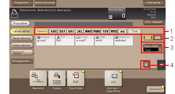 [Carnet d'adresses] affiche la liste des destinations enregistrées sur cette machine. Sélectionnez un index ou un type de destination pour filtrer la liste des destinations et spécifiez la destination cible.