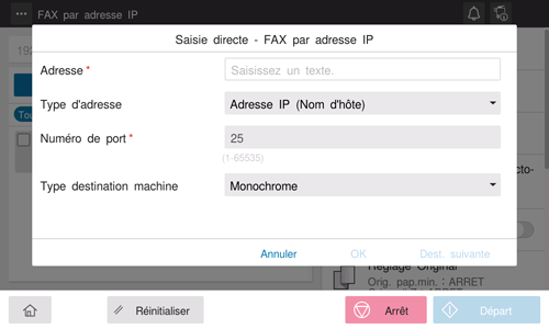 Exemple de saisie de nom d'hôte : "host.example.com" (y compris le nom de domaine à saisir.)Si [Adresse e-mail] est sélectionné comme [type d'adresse], entrez l'adresse e-mail de destination. Pour spécifier une destination à l'aide d'une adresse e-mail, entrez l'adresse IP du destinataire après "ipaddrfax@". Pour entrer une adresse IP, insérez-la entre crochets [ ].
