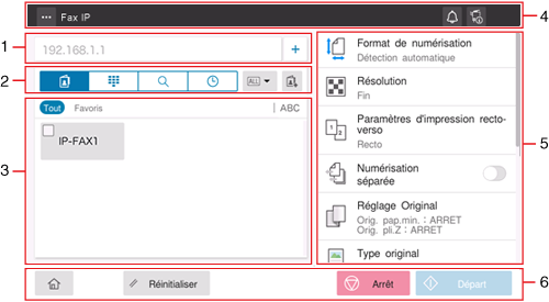Si vous appuyez sur [Fax par adresse IP] sur l'écran d'accueil, l'écran principal de Fax IP (SIP) s'affiche.