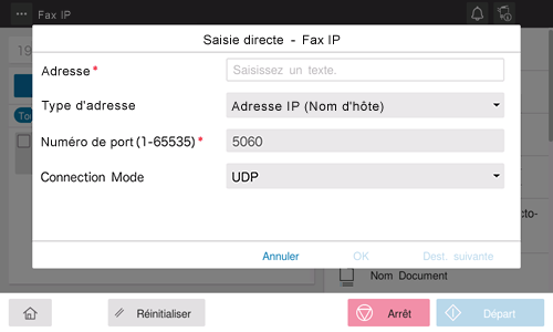 Lorsque [Adresse IP (nom d'hôte)] est sélectionné dans [Type d'adresse], changez le numéro de port si nécessaire (par défaut : [5060]).