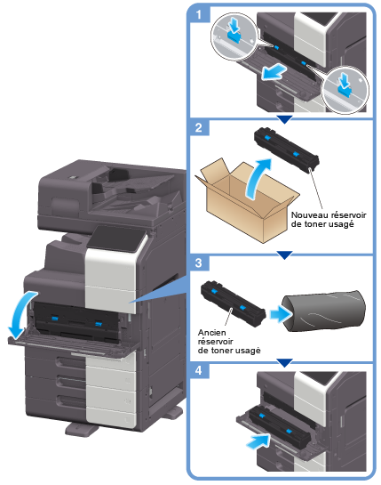 Ne pas forcer l'ouverture des pièces associées au toner (par ex. cartouche de toner, unité de développement et réservoir de toner usagé). Si du toner est expulsé de la cartouche de toner, éviter à tout prix son inhalation ou même tout contact avec la peau.