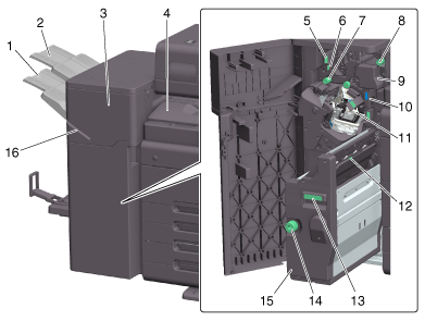 15 | Saddle Stitcher | Pull out this unit when clearing a paper jam or staple jam or when replacing a saddle staple cartridge. |