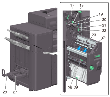 23 | Saddle Staple Cartridge 1 | Pull out this cartridge from the Saddle Stitcher when clearing a staple jam or replacing a saddle staple cartridge. |