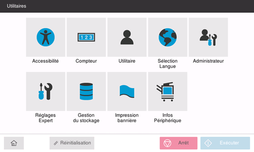 Dans [Accessibilité] sous [Utilitaires], vous pouvez spécifier les options d'accessibilité de l'environnement d'exploitation telles que le réglage de l'écran tactile ou modifier les sons de saisie.