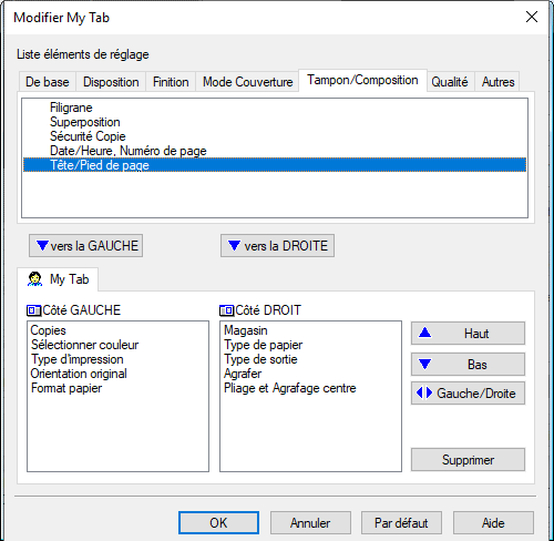Pour redisposer les fonctions enregistrées sur My Tab, sélectionnez la fonction que vous voulez repositionner sur [My Tab] et cliquez sur [Haut], [Bas] ou [Gauche/Droite].