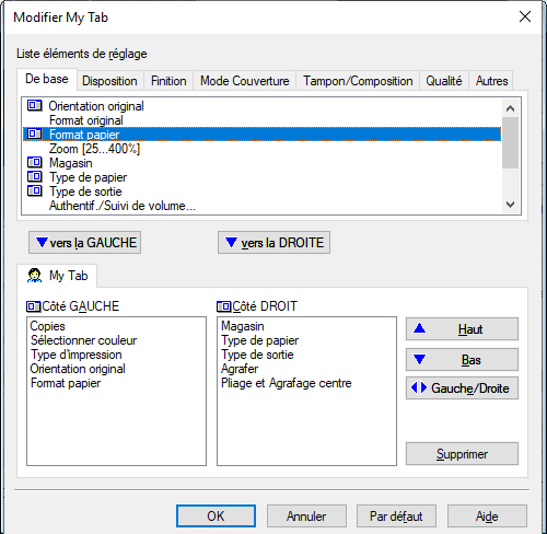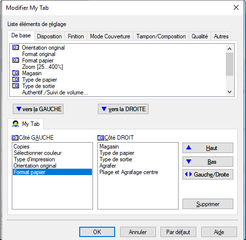 Pour enregistrer des fonctions sur My Tab, sélectionnez les fonctions à enregistrer depuis [Liste éléments de réglage] et cliquez sur [vers la GAUCHE] ou sur [vers la DROITE].