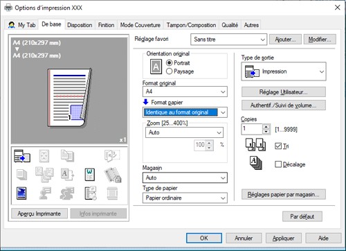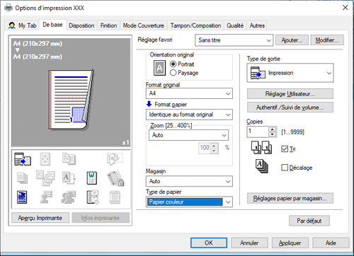 Sous [Format papier] de l'onglet [Param base], sélectionnez le format de papier correct.