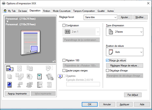 Pour configurer la marge de page, cochez la case [Marge de reliure] sur l'onglet [Disposition] et cliquez sur [Réglages Marge de reliure].