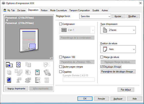 Pour permettre le décalage d'image, cochez la case [Décalage d'image] sur l'onglet [Disposition] et cliquez sur [Paramètres de décalage d'image].
