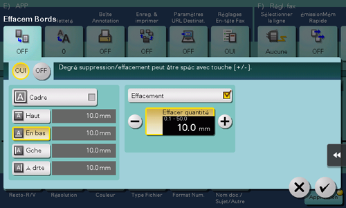 Pour indiquer la largeur du cadre à effacer de manière individuelle, appuyez sur [Bords] pour décocher la case, sélectionnez un côté cible et spécifiez la largeur à effacer.