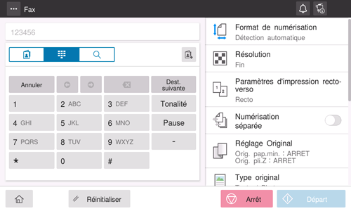 Entrez le numéro de fax de la destination et appuyez sur [Dest. suivante].