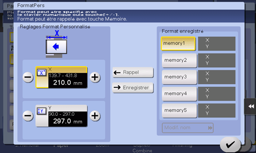Sélectionnez le format papier à rappeler sous [Format enregistré], puis appuyez sur [Rappel].