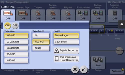 Appuyez sur [OUI], réglez les valeurs pour [Type date], [Type heure] et [Pages], puis appuyez sur [OK].