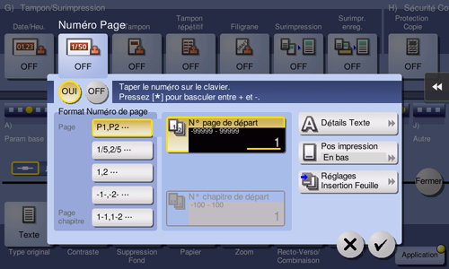 Appuyez sur [OUI], réglez les valeurs pour [Format Numéro de page] et [N° page de départ], puis appuyez sur [OK].