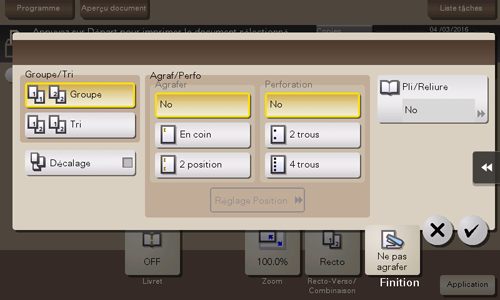 Appuyez sur [Finition] et configurez les différents éléments pour la finition.