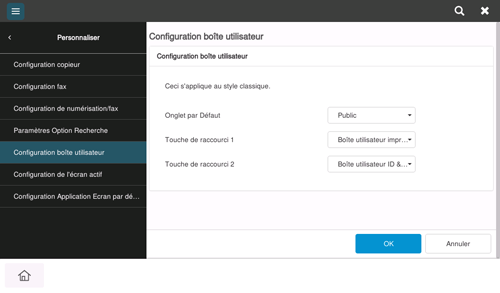 Réglez [Régl. Rapides 1]/[Régl. Rapides 2] sur Oui et sélectionnez le réglage à afficher comme touche raccourci. Appuyez sur ensuite [OK].