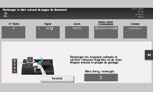Retournez l'original ou le papier et appuyez sur [Valid.] ou sur [Terminer] ; le système reprend la numérisation ou l'impression de l'original.