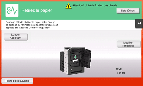 En cas de bourrage papier ou d'agrafes sur cette machine, la procédure d’élimination du bourrage papier ainsi que l'emplacement du bourrage papier ou d'agrafes sont affichés sur l'écran de cette machine. Vérifiez la procédure d'élimination et l'emplacement du bourrage, puis suivez l'aide pour éliminer le bourrage.