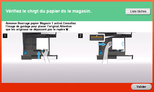 Lors de la libération d'un bourrage papier, un écran affiche la procédure à suivre pour charger correctement le papier ou l'original.