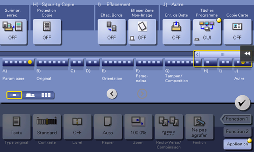 Numérise chaque original chargé avec différents réglages et réalise des copies collectivement. Utilisez cette fonction lorsque plusieurs types d'originaux sont mélangés, par exemple un original recto à imprimer sur une face et un original R/V à copier en l'agrandissant.