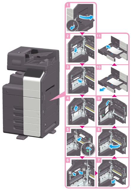 When removing pieces of paper in the paper tray (Tray 1/2)