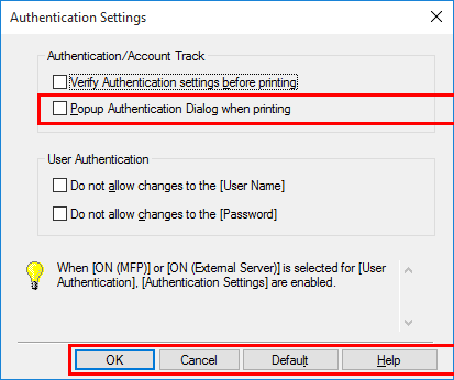 En [Autenticación/Seguimiento de volumen], seleccione la casilla de verificación [Diálogo emergente de autent. al imp.], y haga clic en [Aceptar].