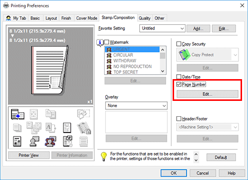 En la pestaña [Sello/Composición], seleccione la casilla de verificación [Número de página] y después haga clic en [Editar].