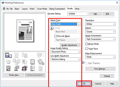 Seleccione [Escala de grises] en [Seleccionar color] en la pestaña [Calidad] y, a continuación, haga clic en [Aceptar].