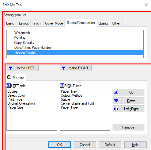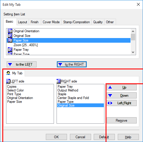 Para reorganizar las funciones registradas en My Tab, seleccione la función que desea reubicar en [My Tab] y haga clic en [Arriba], [Abajo] o [Izq./Derecha].