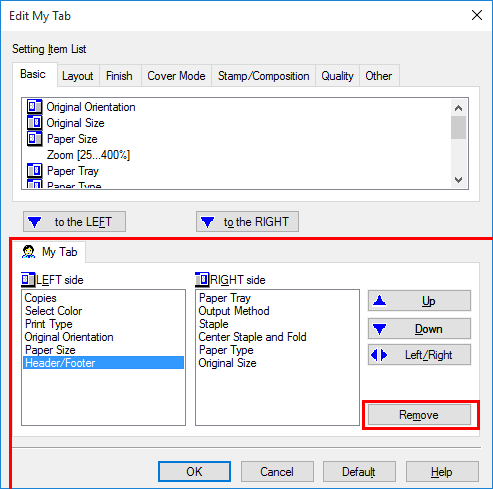 Para eliminar una función registrada en My Tab, seleccione la función que desea eliminar en [My Tab] y haga clic en [Eliminar].