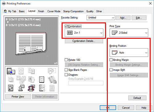 Para imprimir más de una página original en el mismo lado de una única hoja, seleccione la casilla de verificación [Combinación] en la ficha [Diseño] para seleccionar un formato de combinación de páginas. Para imprimir en ambas caras del papel, seleccione [2 caras] en [Tipo de impresión] en la ficha [Diseño].