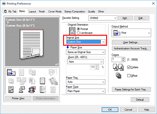 En [Tamaño del original], en la ficha [Básico], seleccione [Tamaño pers.]