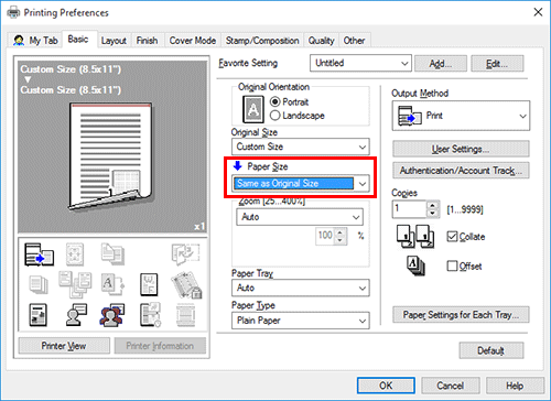 En [Tamaño de papel] en la pestaña [Básicas], seleccione el tamaño de papel correcto.