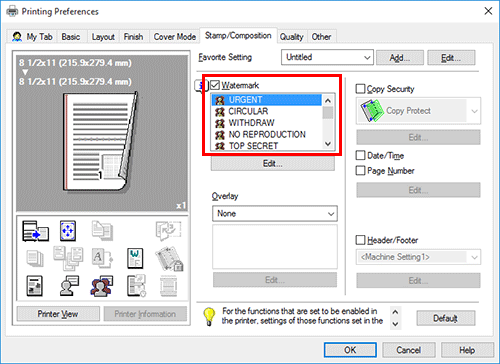 En la pestaña [Sello/Composición], seleccione la casilla de verificación [Marca de agua] y, a continuación, seleccione una marca de agua.