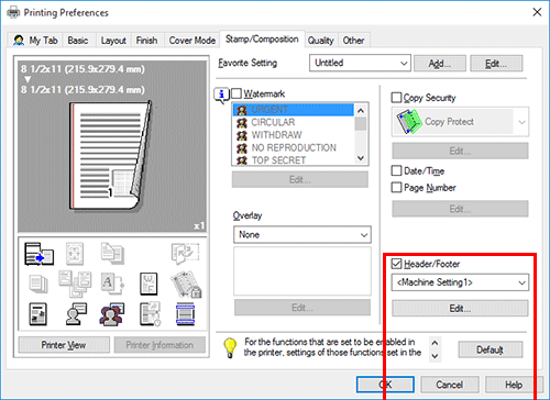 En la pestaña [Sello/Composición], seleccione la casilla de verificación [Encabezado/pie] y después seleccione la información que se va a imprimir.