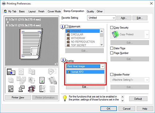 Para imprimir un documento de un archivo creado en un ordenador, seleccione [Imprim imag en equipo host] en [Superposición] en la pestaña [Sello/Composición] y después seleccione el archivo para la impresión de superposición.