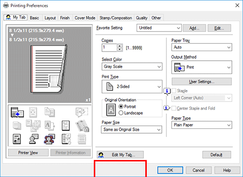 R. Sí. Es posible personalizar de forma sencilla la ventana desde la ventana Propiedades del controlador de impresora registrando funciones utilizadas con frecuencia en masa en My Tab o registrando los ajustes para las correspondientes fichas como favoritos para una activación rápida.