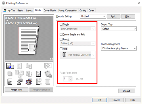Seleccione la casilla de verificación del acabado deseado en la ficha [Finalizar]. Si ha seleccionado las casillas de verificación [Grapar], [Perforar] o [Plegado], especifique la cantidad, posición y otros ajustes necesarios.