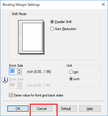 [Lado frontal]/[Lado posterior] | Introduzca el ancho del margen de página. Para la impresión a 2 caras, la desmarcación de la casilla de verificación [El mismo valor para los lados frontal y posterior], permite especificar diferentes valores para los lados frontal y posterior. |
