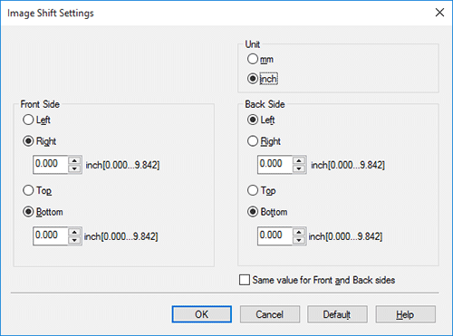 [Lado frontal]/[Lado posterior] | Configure la dirección y el valor para modificar la posición de impresión. Para una impresión a 2 caras, al seleccionar la casilla de verificación [El mismo valor para los lados frontal y posterior] es posible especificar el mismo valor para los lados frontal y posterior. |