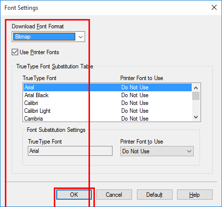 Seleccione [Mapa de bits] en [Descargar formatos de fuente] y, a continuación, haga clic en [Aceptar].