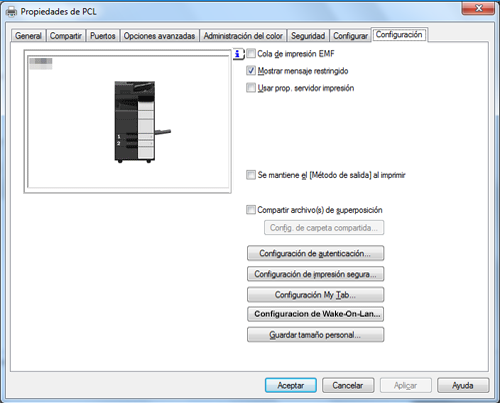 R. En la ventana Propiedades de la impresora, configure la opción para que se muestre la ventana emergente de configuración de autenticación cuando se vayan a imprimir datos.