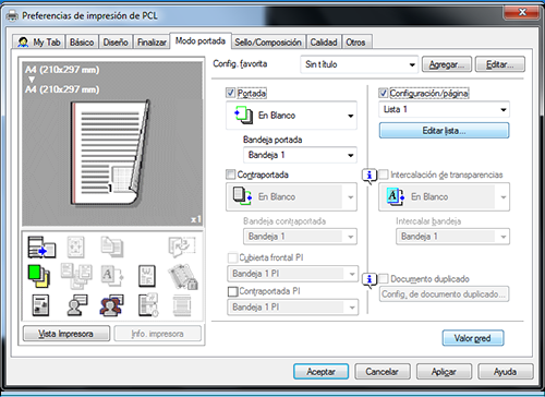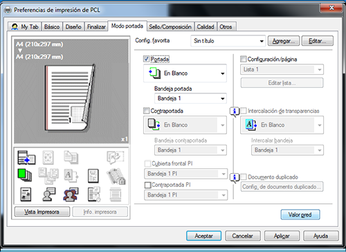 Seleccione [En Blanco] o [Imprimir] en [Portada frontal] y una bandeja de papel en [Bandeja portada frontal].