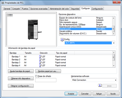 En [Opciones dispositivo] en la pestaña [Configurar], seleccione [Autenticación] y, a continuación, seleccione el estado de autenticación en [Configuración].